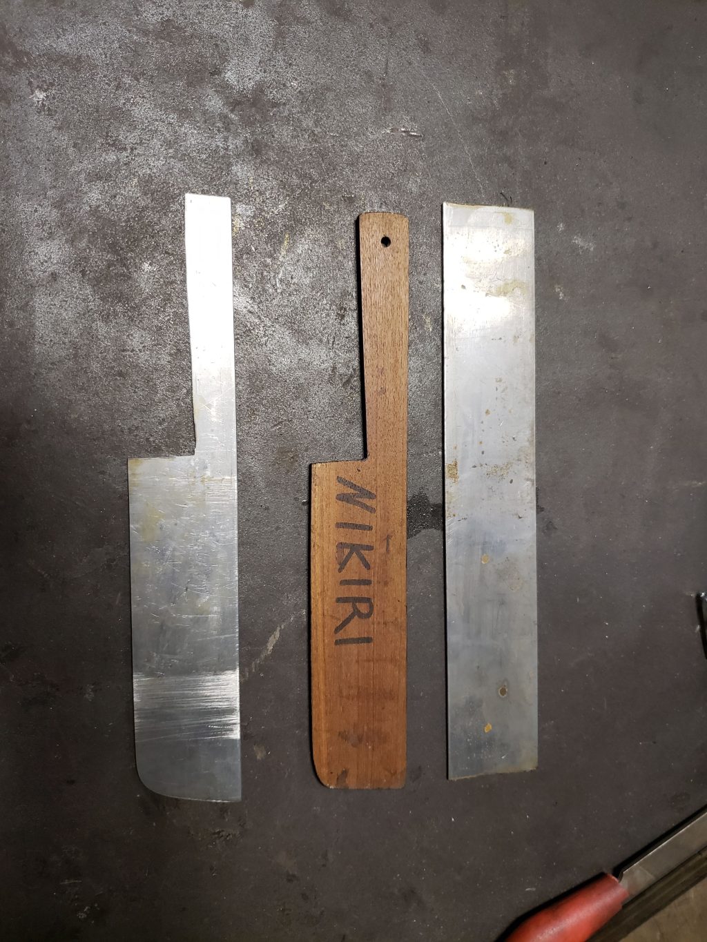 Making a knife starts with a bar of specially formulated high-carbon steel, a foot long, two inches wide, and a quarter inch thick. Using one of the dozens of templates, I drew the outline of the knife, and then the fun began. I chose a Japanese nakiri, not because it was fancy, but because it’s essentially a sharpened rectangle. I cut the rough outline with an angle grinder and refined it on a belt sander. Sparks were flying everywhere and, even though I had hearing protection, it’s really, really loud.