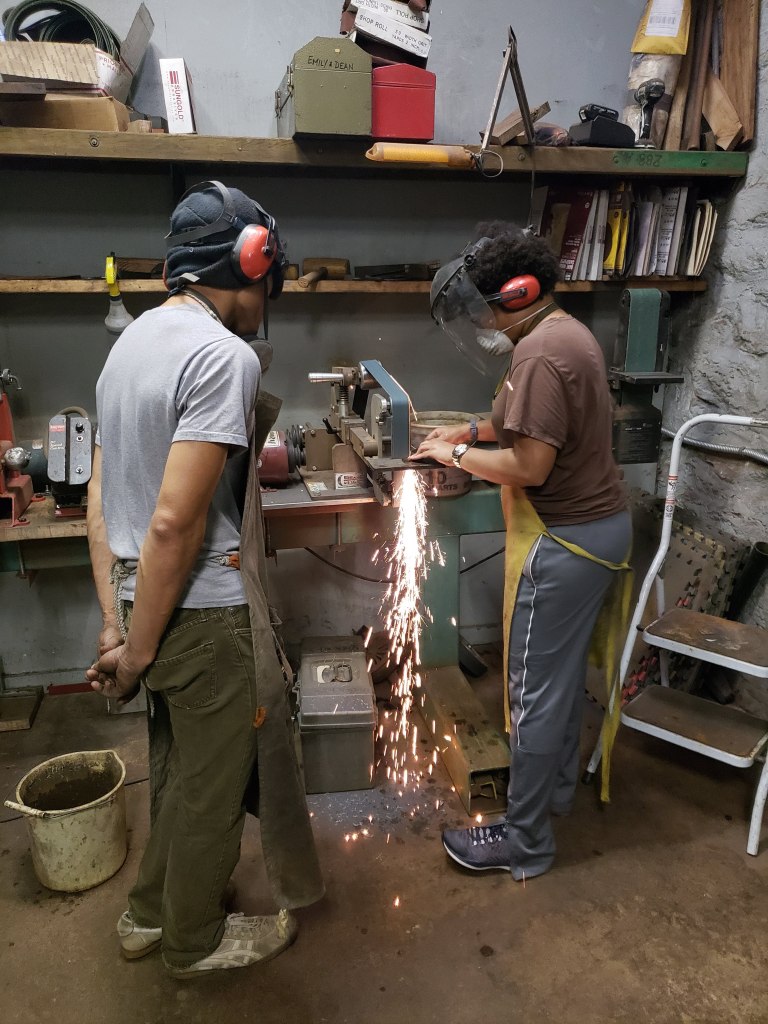 Next, using a belt grinder, I started creating the bevel (or geometry, for those in the know) that forms the blade of the knife. This is the longest, dirtiest, and loudest part of the process. Even with all that power, I needed hours of class time to get the geometry just right.